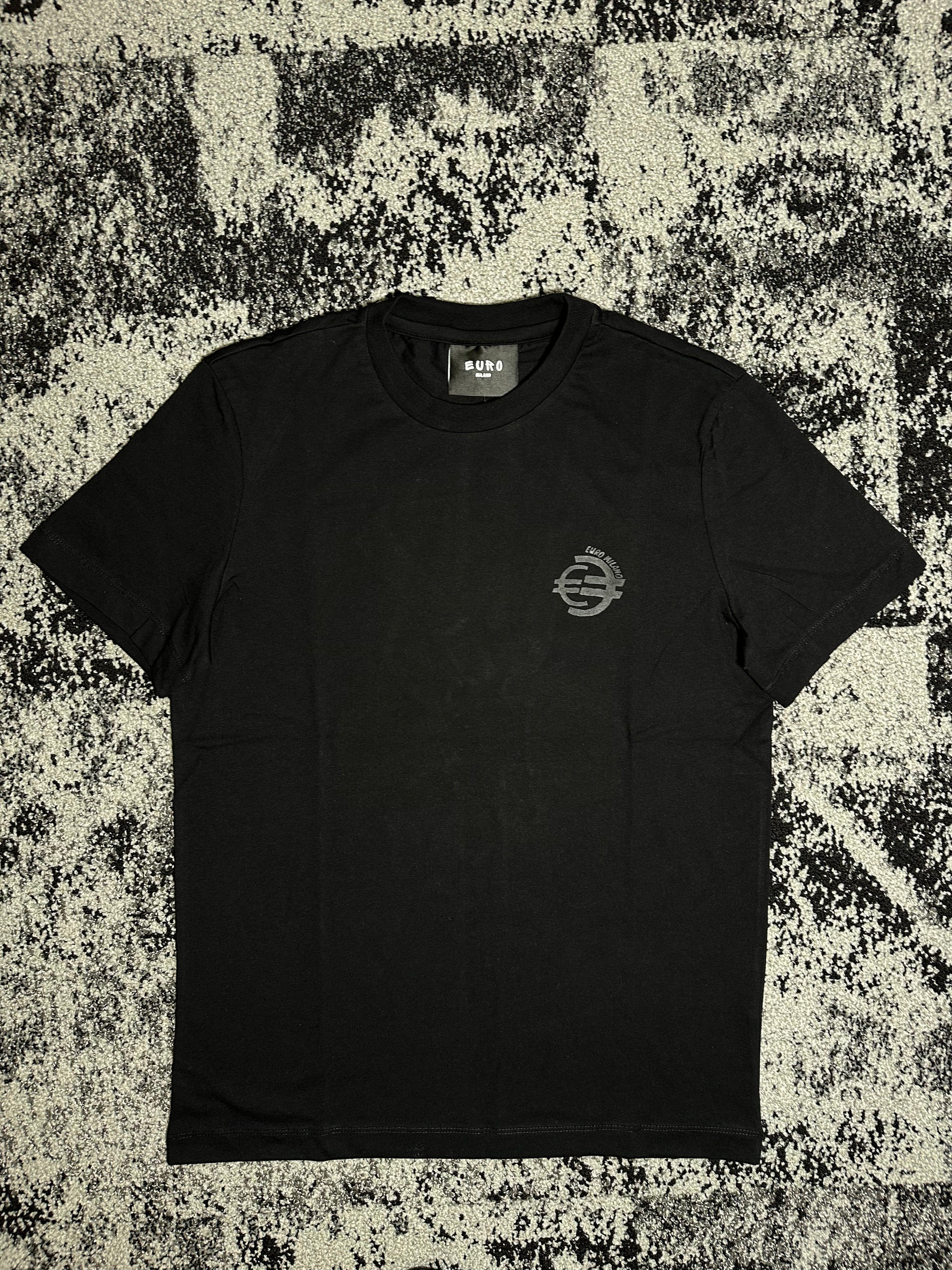 European sized tee with small black logo in front.